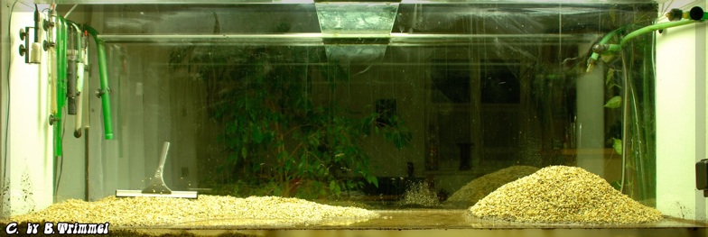 Frohen Mutes schritt ich zur Tat und entsorgte einmal den ganzen alten Kies. Dies funktioniert, wenn man erfinderisch ist recht gut mit einem Mammut-garten-schlauch und einer Mulmsaugglocke. So saugte ich einfach wie mit einem Staubsauger das ganze Becken, die Fische wurden natürlich vorher rausgenommen ;-) ,