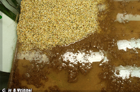 in die Hauseinfahrt, ohne die ganze Patzerei und ohne Kübel zu schleppen. Als das Becken ‘‘clean‘‘ war begann ich es mit Deponit zu füllen. Mit selbigen hatte ich in letzter Zeit bei den kleineren Becken guter Erfahrungen gesammelt, zur Illustration befindet sich schon etwas Kies über der Düngerschicht :